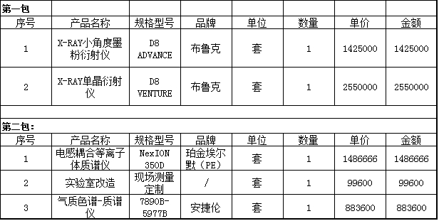 为进步提高教学科研水平,西北师范大学理科分析测试平台建设项目对仪器设备以公开招标形式进行采购,近日对中标结果进行公布,珀金埃尔默、布鲁克、乐鱼线上平台(集团)官方网站分析以及安捷伦等品牌仪器中标。此次采购共分为5包,其中1、2包为分析仪器类,1包中标金额为3975000元,2包中标金额为2469866元。